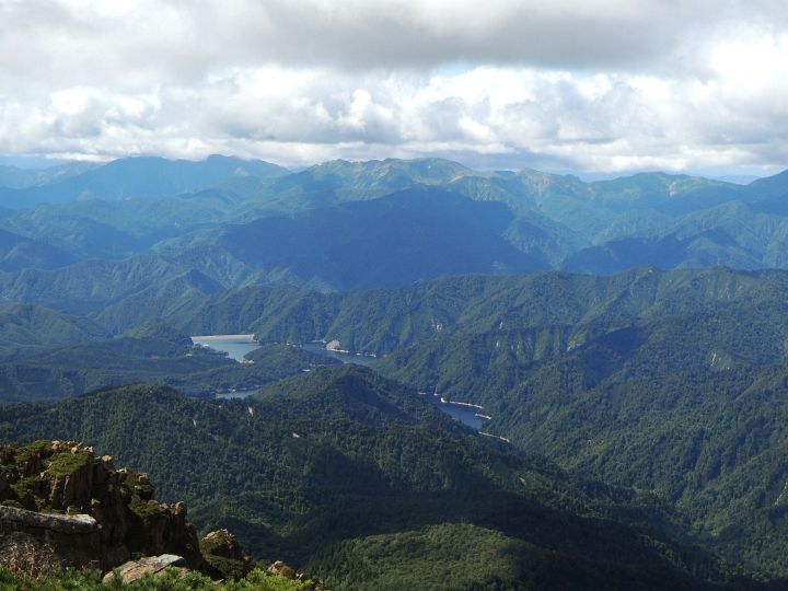 西側。左奥が谷川岳で、ほぼ中央が朝日岳、その右は大烏帽子山と檜倉山。下には奈良俣ダムとならまた湖。