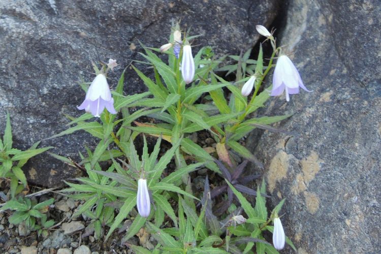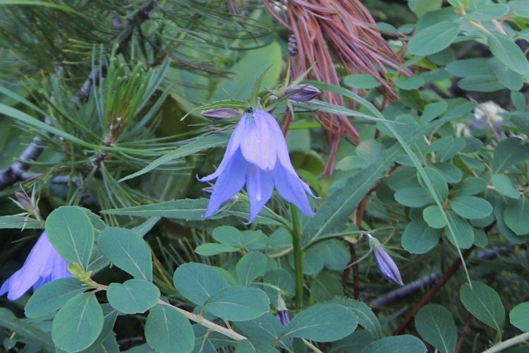 足元に咲いていたキキョウ科ホタルブクロ属のチシマギキョウ。イワギキョウに似るが、本種は横向きに咲いて、花に白い毛が密集する。