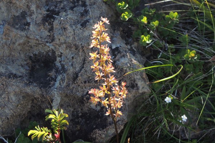 花なのか分からないまま写真に収めたが、オソバノキソチドリというラン科の高山植物だった。