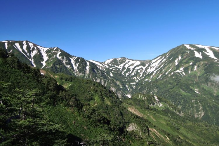 蓮華温泉手前の林道から眺めた西側の峰々。左から雪倉岳、赤男山、朝日岳、五輪山。