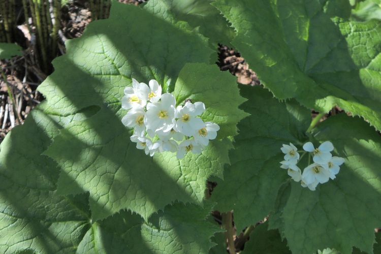 メギ科のサンカヨウ。フキのような大小2枚の葉の上に白い花をつける。花びらは雨に濡れると透明になる。