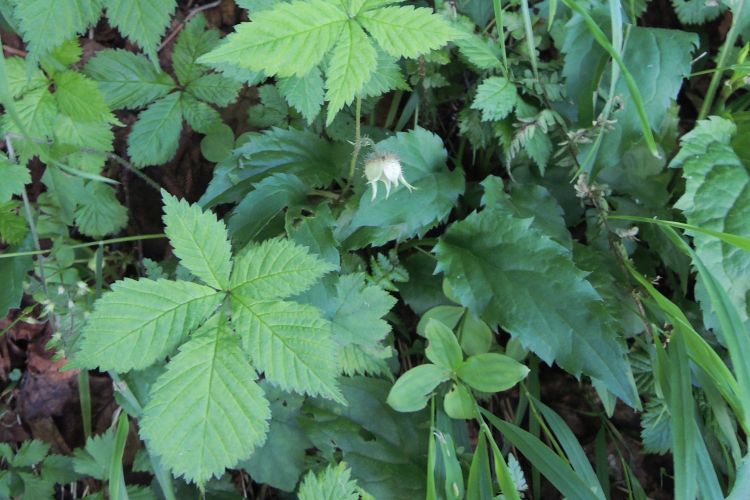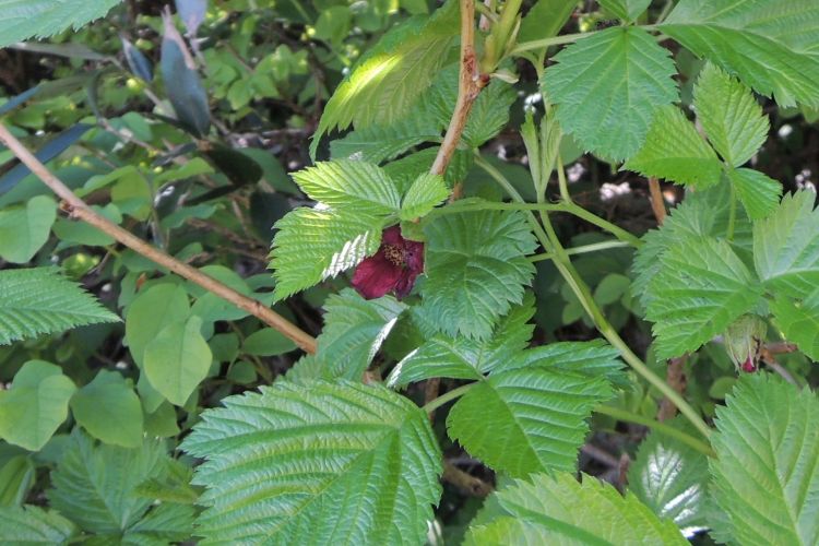 同じバラ科の落葉小低木、ベニバナイチゴ。葉は3出複葉で重鋸歯がある。