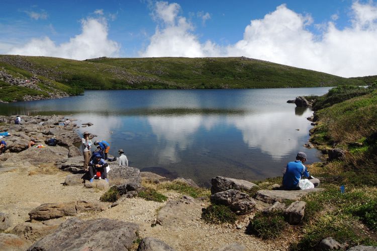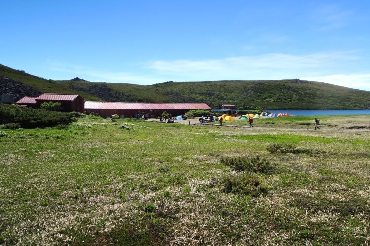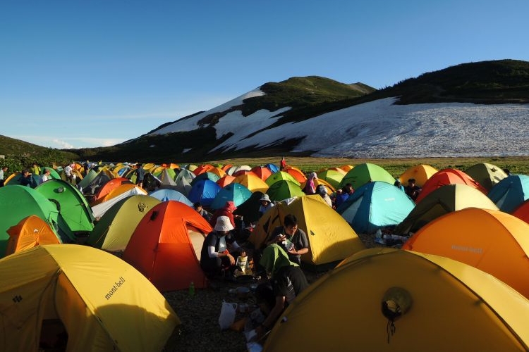 上から眺めたテント場の混雑ぶりには驚いた。普段は解放されていない池畔まで、びっしりテントが並んでいる。