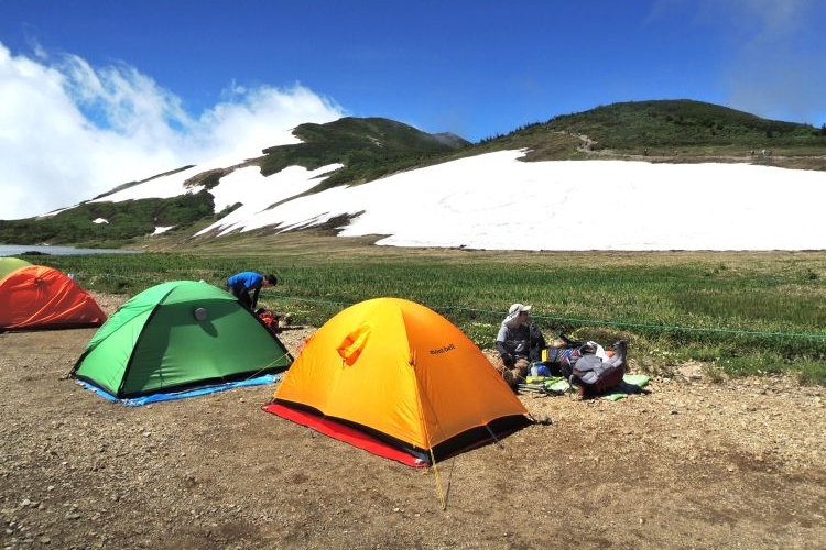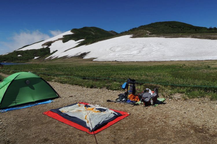 20分ほどで設営を完了。白馬大池のサイトは平らな場所が多く、ペグがしっかり効いて打ちやすい、ほどよい固さの地面だった。
