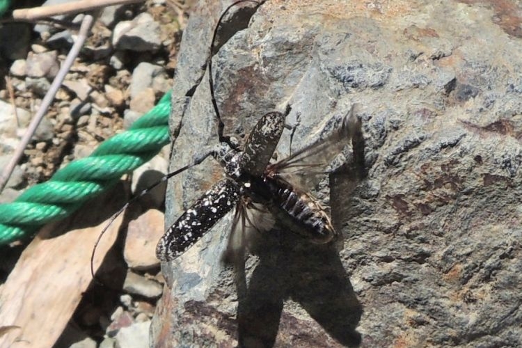 写真を撮ろうと岩の上に置いたら、すぐ飛んで逃げた。開聞岳でも見たゴマダラカミキリかと思ったが、シラフヒゲナガカミキリのようだ。