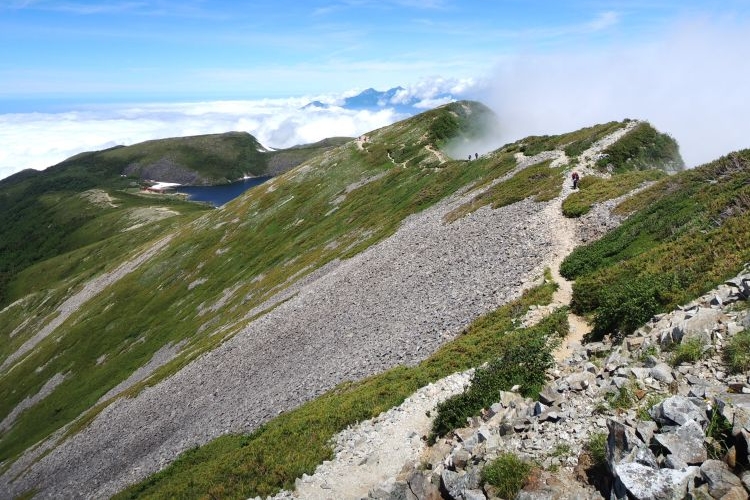13:00 白馬大池へ下山開始。稜線の東側からガスが上がってきていたが、波打つような稜線が綺麗に見えていた。