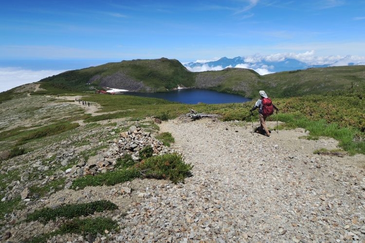 標高2,380mにある白馬大池。空を映した深い青の湖面が鮮やかだった。