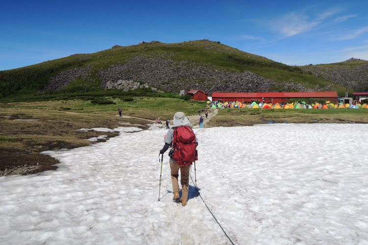 白馬大池のテント場が見えてきた。花を見ながらということもあって、コースタイム3時間のところを4時間かかった。