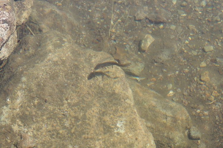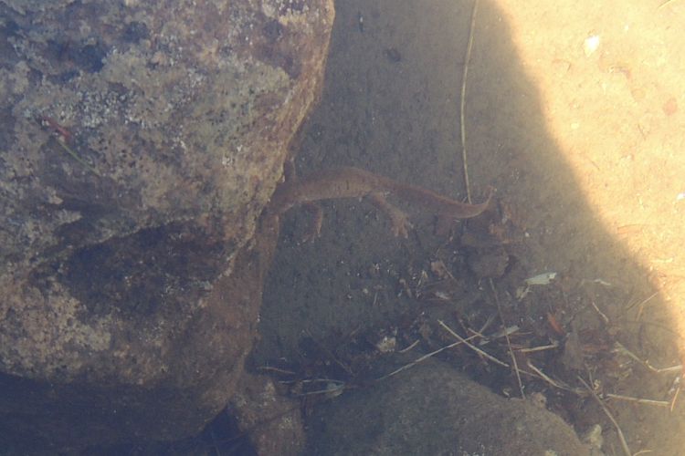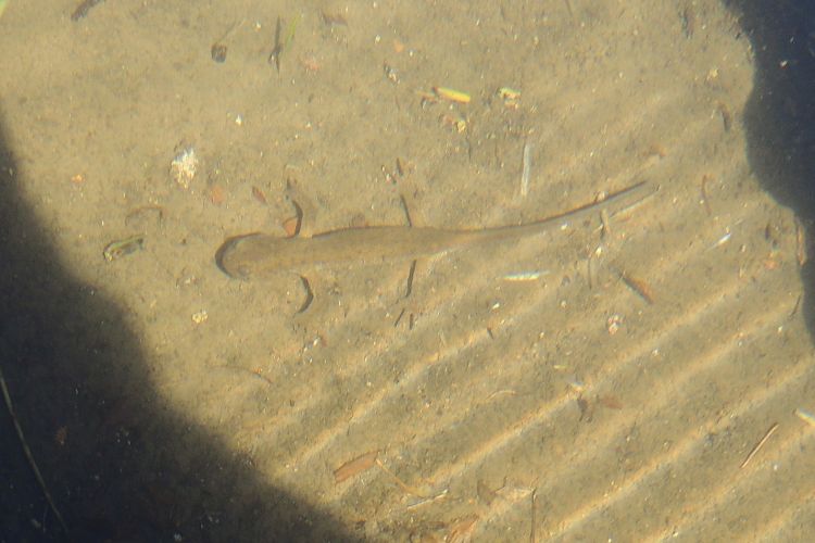 外鰓のない成体を発見。手の届くところにいたので触ってみると、ぬるりとした感触だった。自分の縄張りがあるのか、いったん遠くに逃げた後でまた戻ってきた。