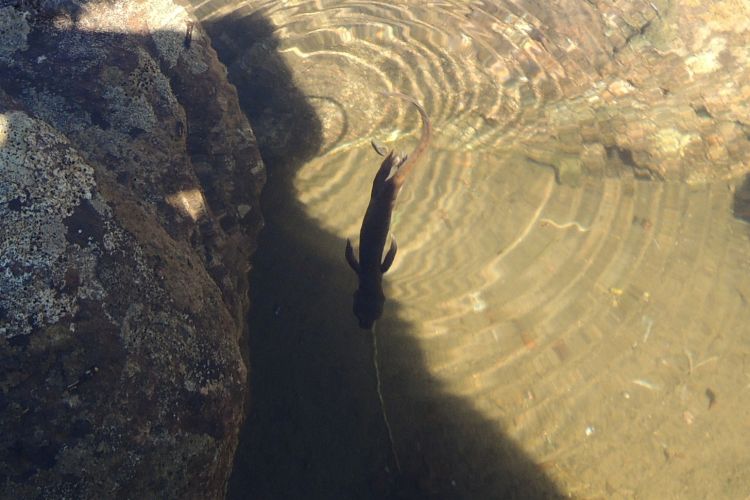 近くに場所を移すと、岩の浅い水たまりに小さな幼体を見つけた。オタマジャクシのように頭でっかちで、エラに隠れているのか、前肢はほとんど見えない。