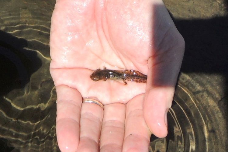 追い込み漁の要領で、小さなクロサンショウウオの幼体を手のひらにすくってみた。柔らかな身体はとても脆弱な感触だった。弱ってしまわないように、写真を撮ったらすぐ逃がしてやった。