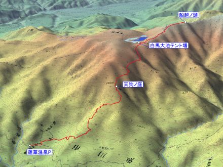 蓮華温泉駐車場 5:20 ⇒ 7:45 天狗ノ庭 8:05 ⇒ 9:40 白馬大池テント場 10:40 ⇒ 12:15 船越ノ頭 13:00 ⇒ 白馬大池テント場 14:00