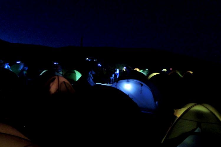 17時過ぎにテント場に戻ると、初日よりは混雑度が緩和されていた。年季の入った隣のベテラン登山者とちょっとした話をしながら夕食をすませて、この日も明るいうちに横になった。寝不足とたまった疲れですぐ眠りに落ちたが、23時過ぎに左肩の痛みで目が覚めた。忘れた頃に石灰性腱板炎の症状が出てしまい、テント泊2日目の夜は昼間と正反対にツラくて長い試練となった。