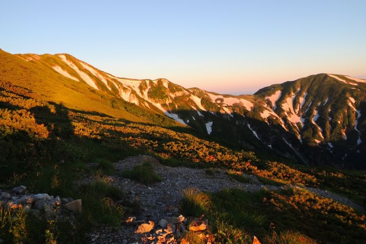 モルゲンロートに染まる小蓮華山(左)と雪倉岳(右)。素晴しい一日になるという予感にテンションが上がった。