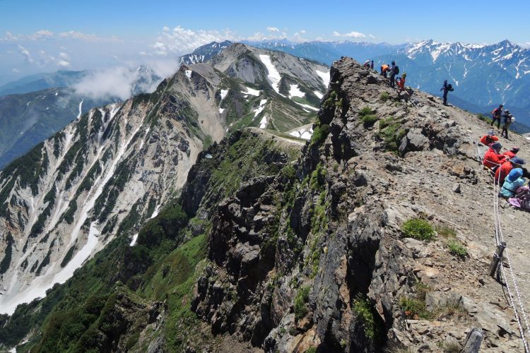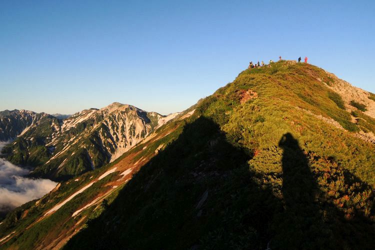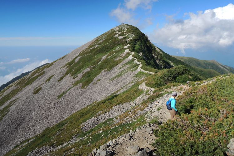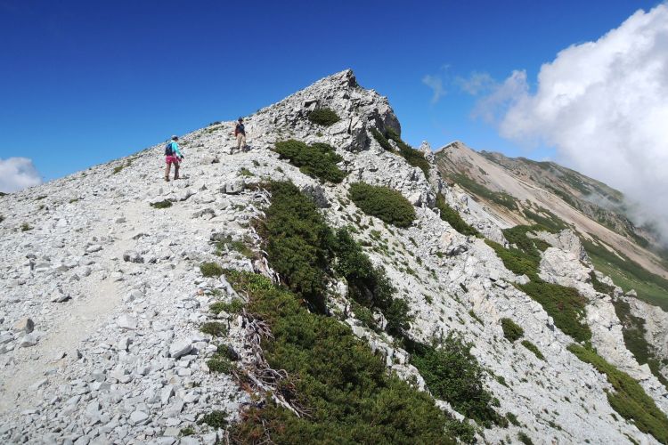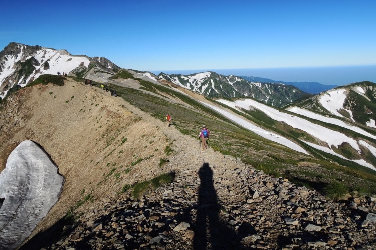 船越ノ頭に到着。小蓮華山へと向かう稜線上に、登山者の姿が点々と見えた。左に杓子岳と鑓ヶ岳が重なって見える。