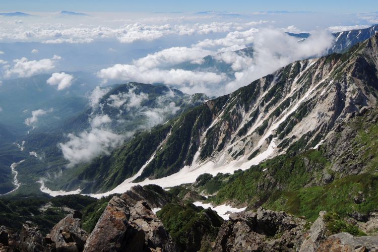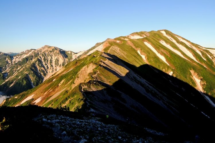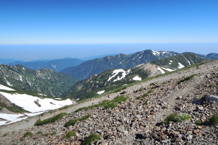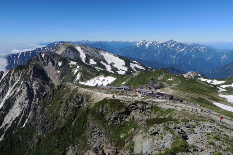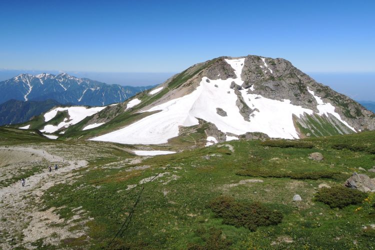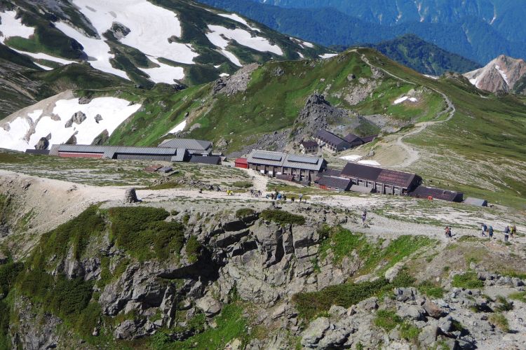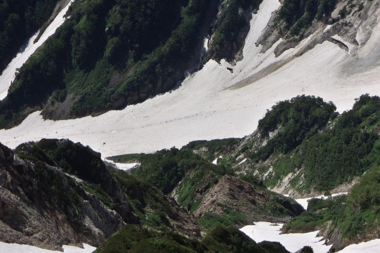 目を凝らすと、大雪渓を上る登山者の列が小さく見えた。