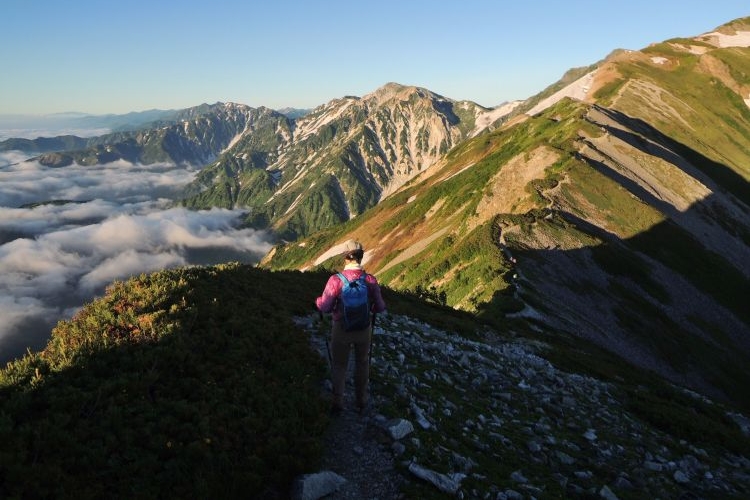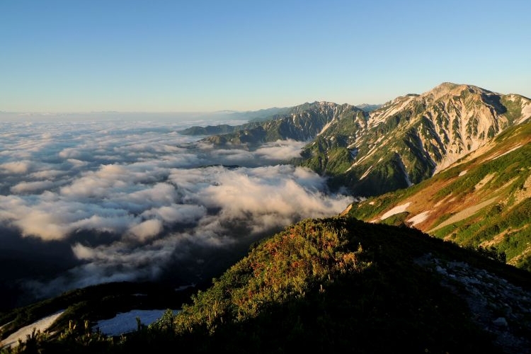 早朝から雲ひとつない快晴で、遥か先まで遠望がきいた。鑓ヶ岳の奥には北アルプスの峰々が並び、南側には雲海が広がっていた。