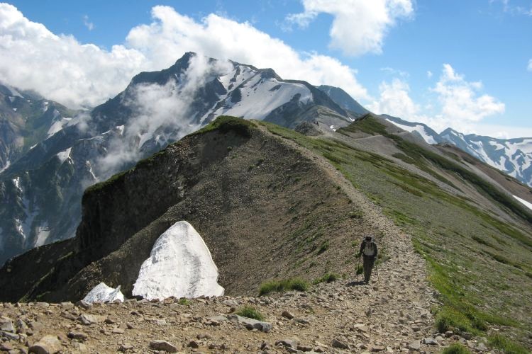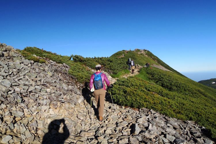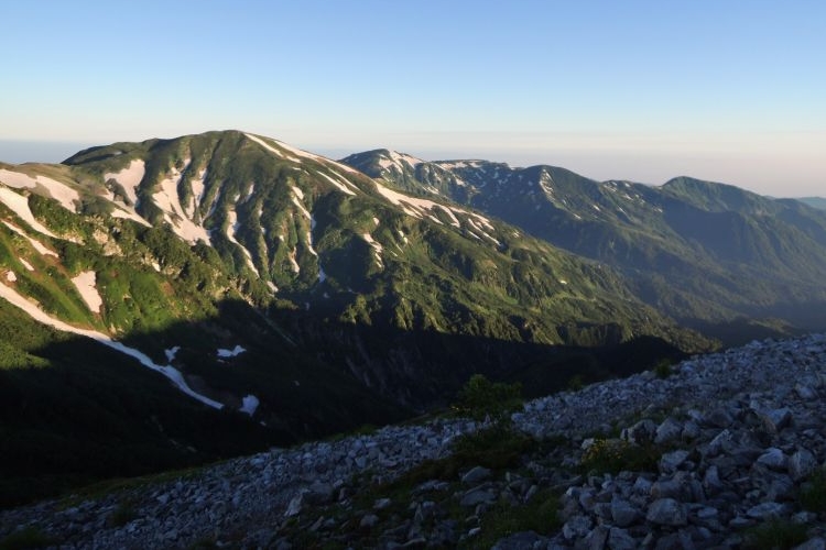 7:30 三国境に到着。北西側には鉢ヶ岳から雪倉岳、朝日岳へと続く稜線が一望でき、そちらへ向かう登山者もいた。
