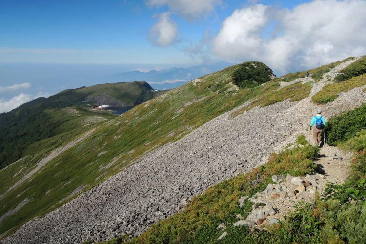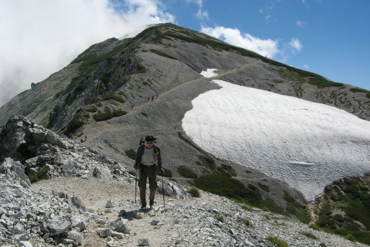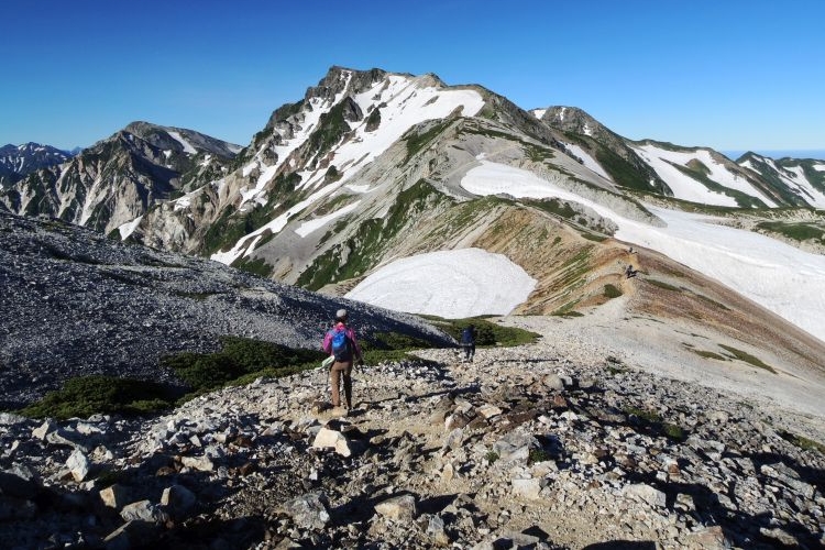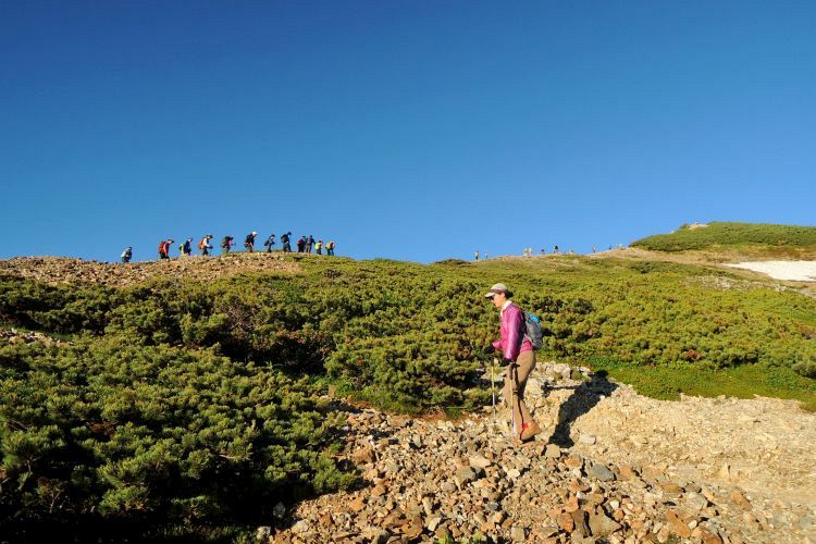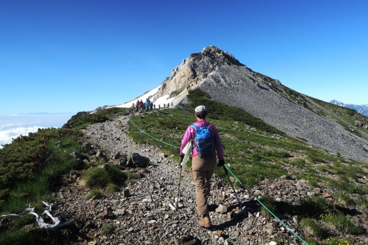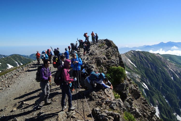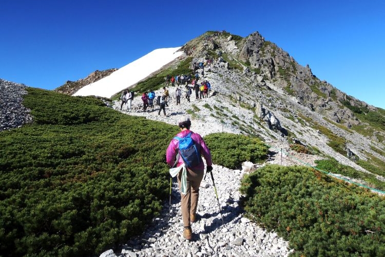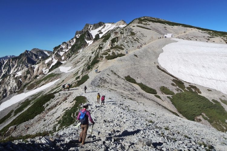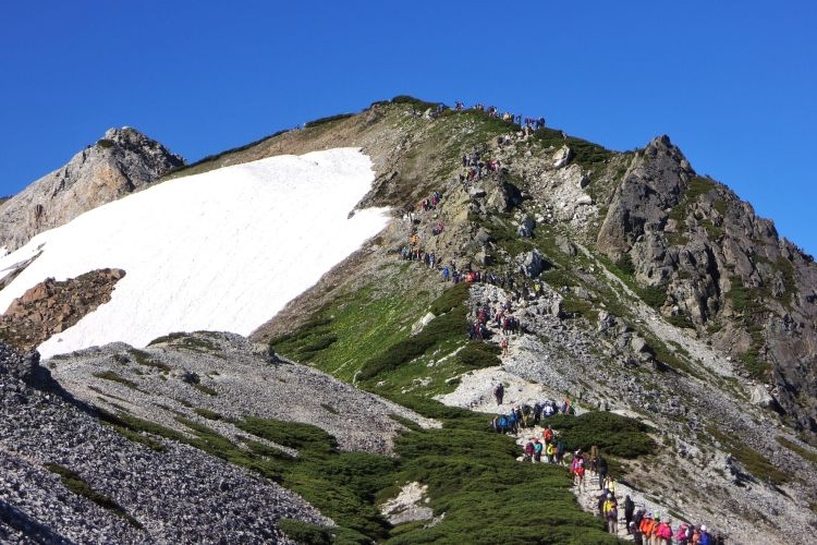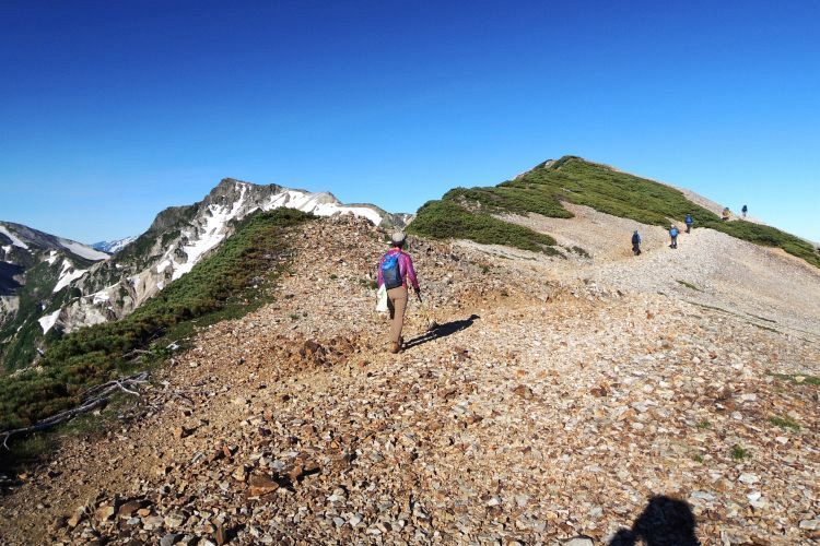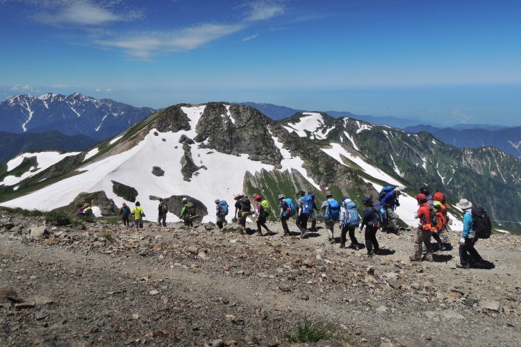白馬山荘の方へ向かう登山ツアーの集団。中には40人もの大所帯も見かけたが、大人数なのにすれ違う登山者を延々と待たせる集団にも遭遇した。無理な計画でトラブルに見舞われた登山ツアーの話も耳にしたし、けしからんツアーガイドが多くならないことを願う。