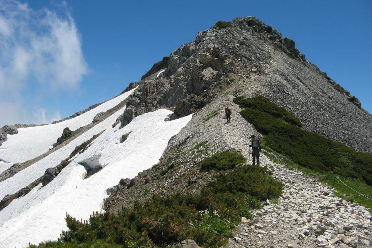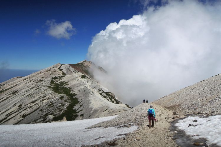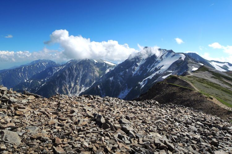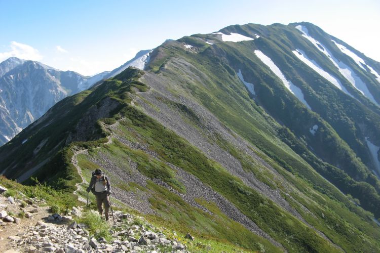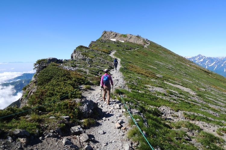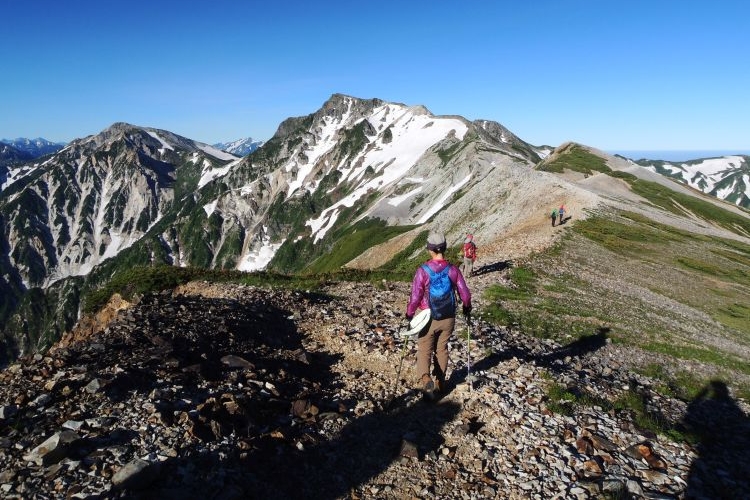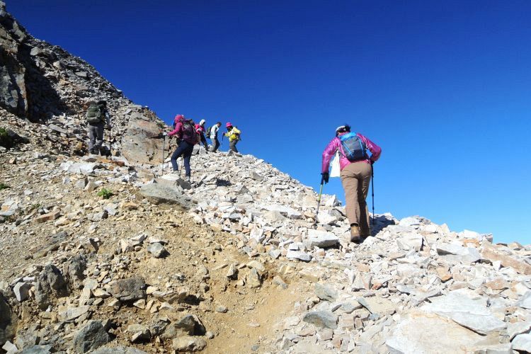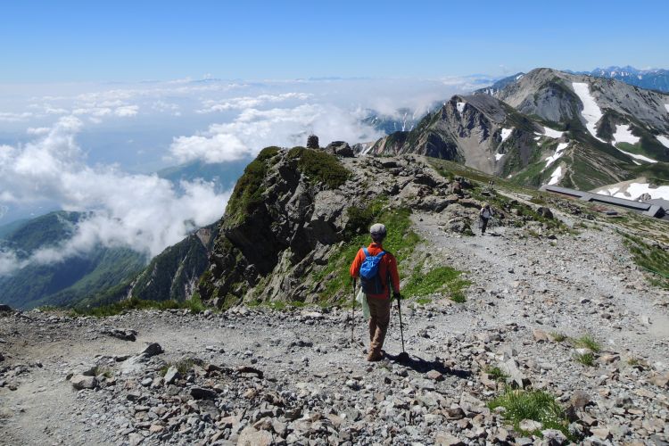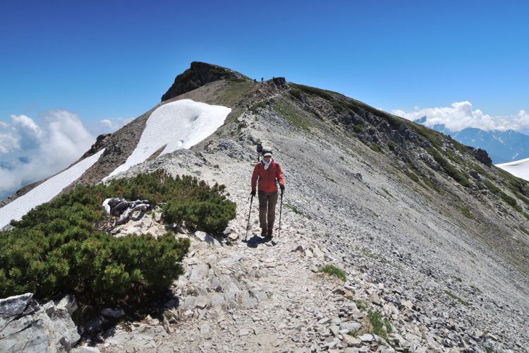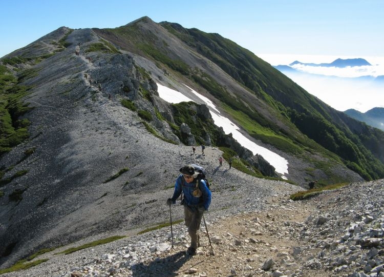 白馬山荘の方へ向かう登山ツアーの集団。中には40人もの大所帯も見かけたが、大人数なのにすれ違う登山者を延々と待たせる集団にも遭遇した。無理な計画でトラブルに見舞われた登山ツアーの話も耳にしたし、けしからんツアーガイドが多くならないことを願う。