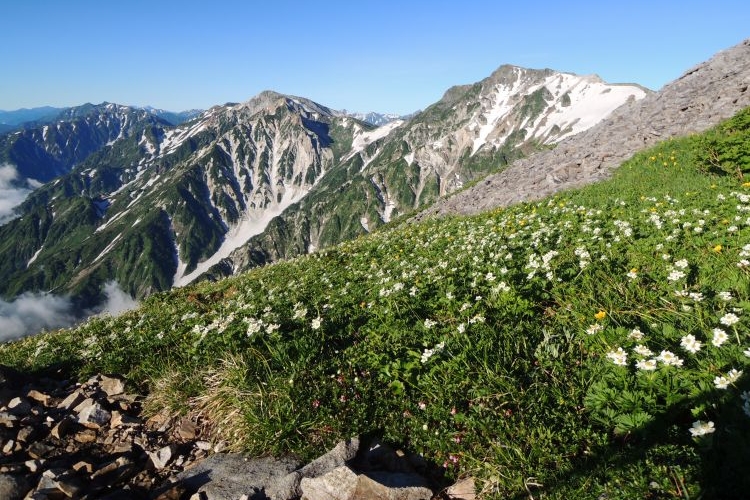 しばらく上ると鑓ヶ岳の右に白馬岳が見えた。手前にはハクサンイチゲのお花畑。