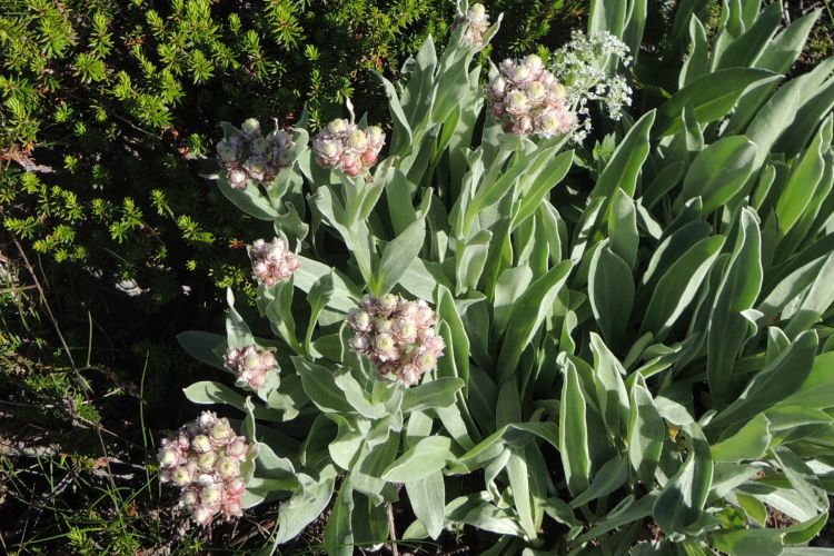 キク科のタカネヤハズハハコ。頭状花は淡いピンク色で、全体が白い綿毛に覆われている。別名タカネウスユキソウ。