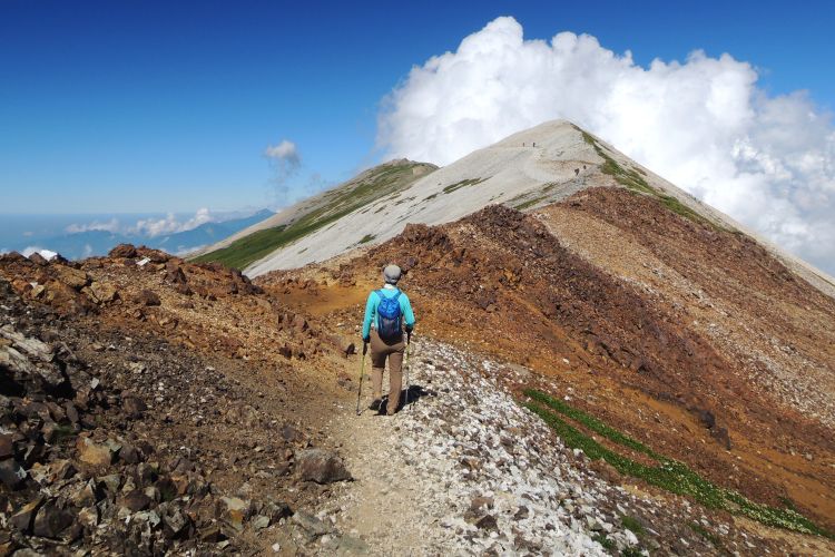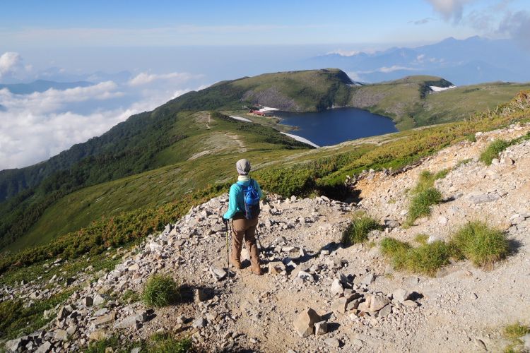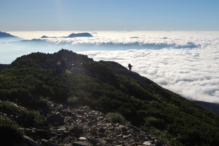 東側を振り向くと、雲海を歩いているような登山者の姿があった。小さなアップダウンが続いたが、眺めのよさと次々に現れる花の色どりで、まったく疲れを感じなかった。