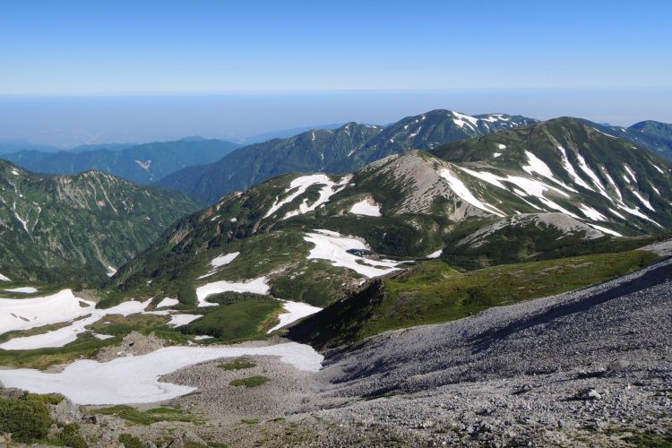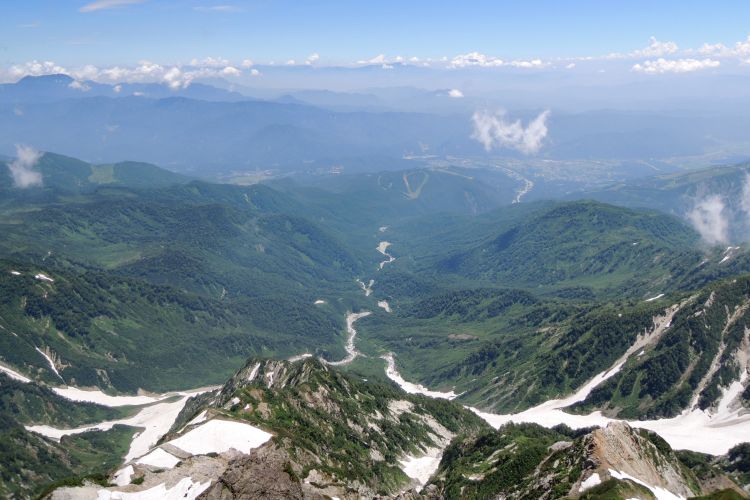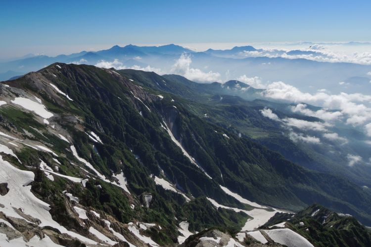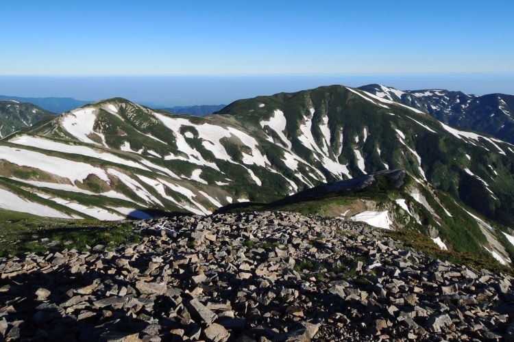 西から北西側には、鉢ヶ岳から雪倉岳、朝日岳と続く稜線がのびる。その向こうには富山湾と日本海。