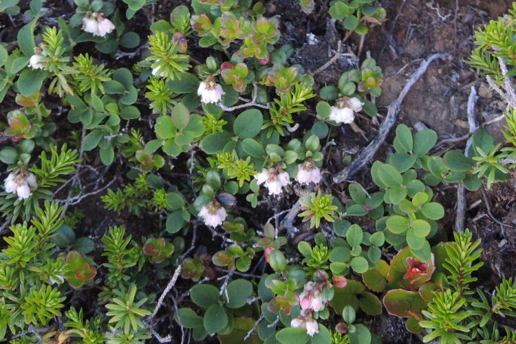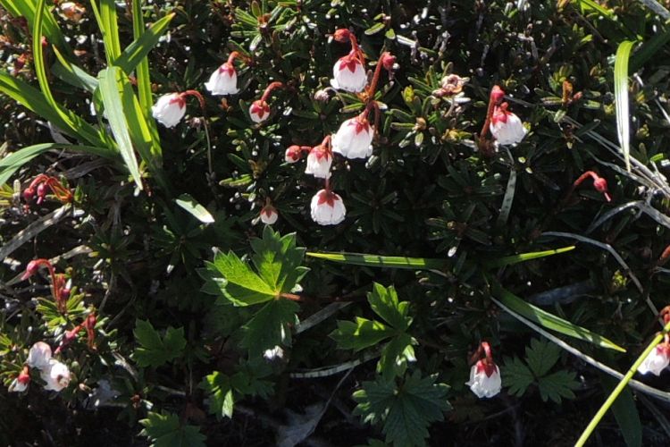 アカモノとはちょっと違う小さな鈴のような花を見つけたが、ツツジ科の常緑小低木、コケモモだった。