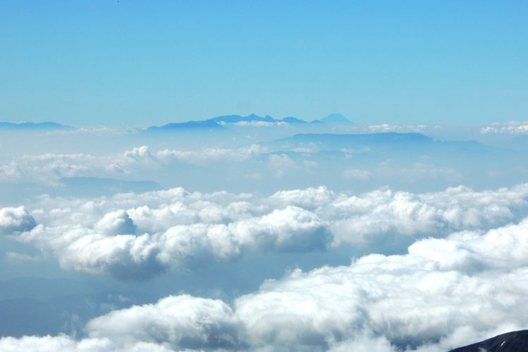 南東の雲海上には八ヶ岳と富士山まで見えた。富士山の手前の棚のような山は美ヶ原高原。左端は金峰山と朝日岳。