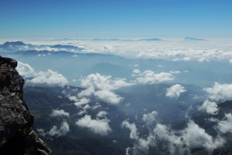 東側。左の高妻山の右隣に見えるのが戸隠山。その上の雲海に浮かぶのは岩菅山で、右へ横手山と白根山、四阿山と続く。右端には浅間山も頭をのぞかせている。