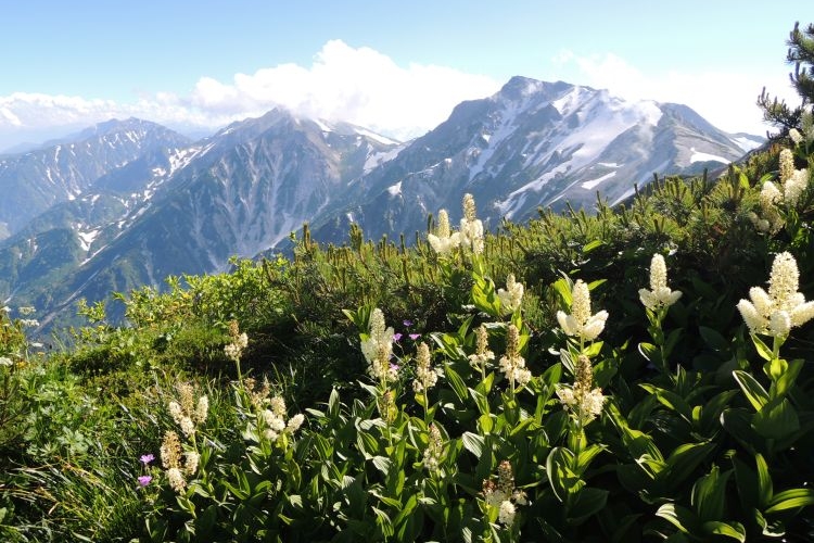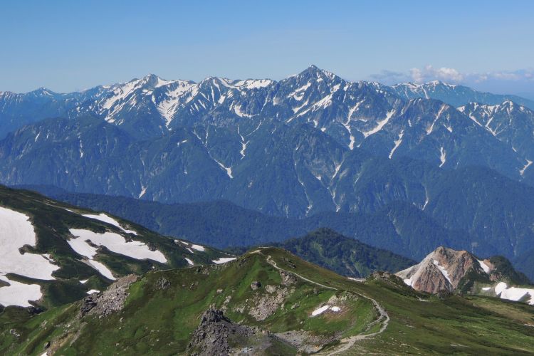 南側には(右から)白馬岳、鑓ヶ岳、鹿島槍ヶ岳と遠近法の手本のように三角の頂が並び、景観に壮大な奥行きを感じさせる。