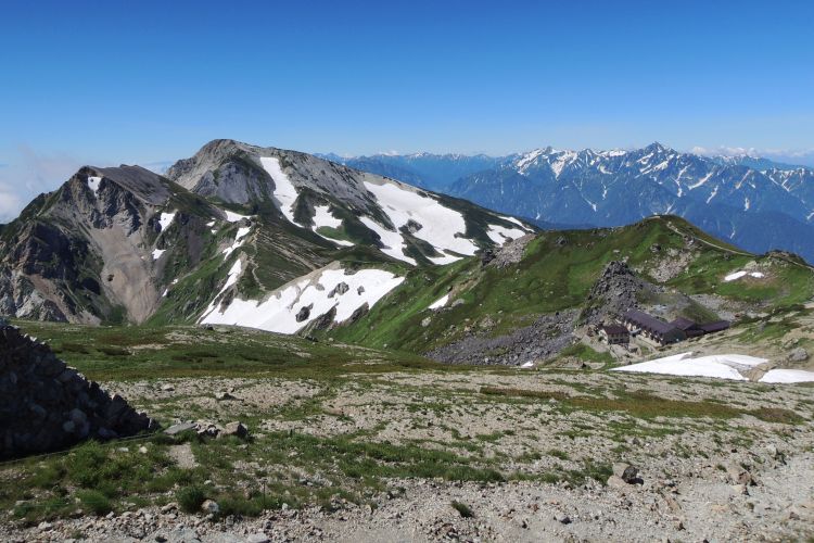 左には白馬三山の杓子岳・鑓ヶ岳、右には立山と剱岳。眼下には白馬岳頂上宿舎も見える。