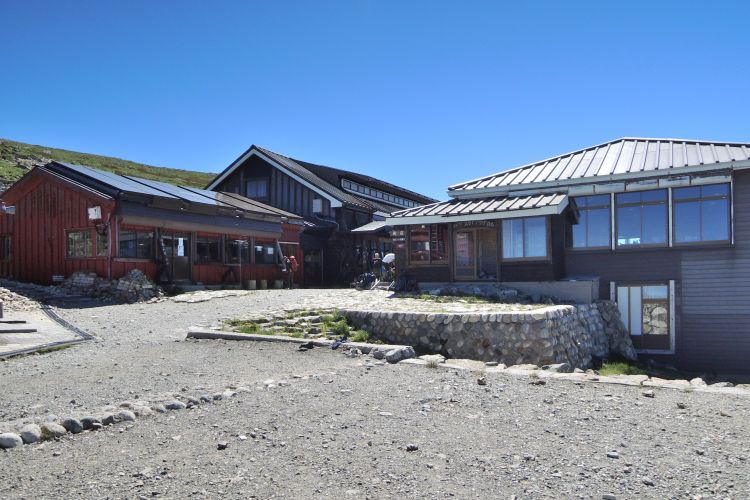 標高2,832mにある白馬山荘に到着。山荘は3つの宿泊棟と、レストランや売店の入った「スカイプラザ白馬」からなる。写真は第2新館で、この奥に第3新館がある。前日の宿泊者は出払った後らしく、山荘の周囲は人が少なくて静かだった。