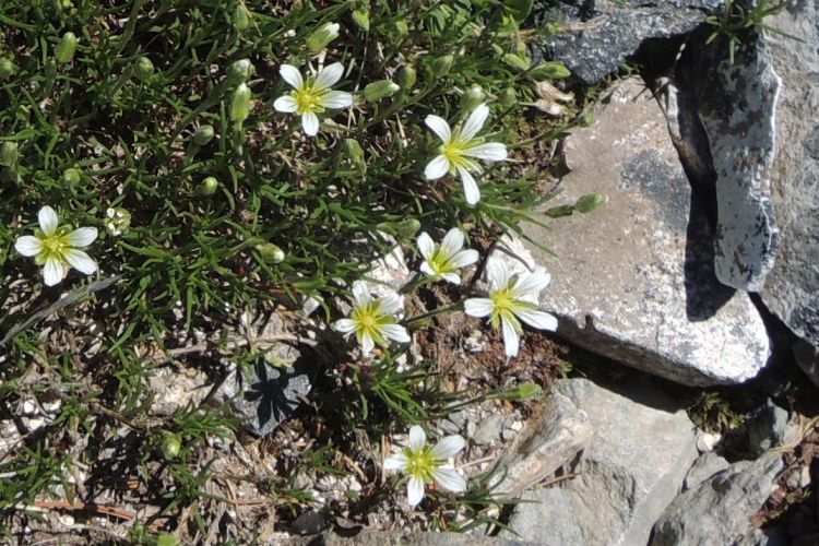 ナデシコ科のクモマミミナグサ。ミヤマミミナグサの変種で、花弁は中ほどで2つに分かれている。