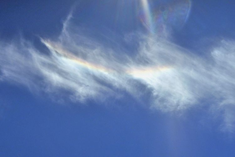 隣で休んでいた登山者が空の虹色現象に気がついた。環水平アークだろうか。