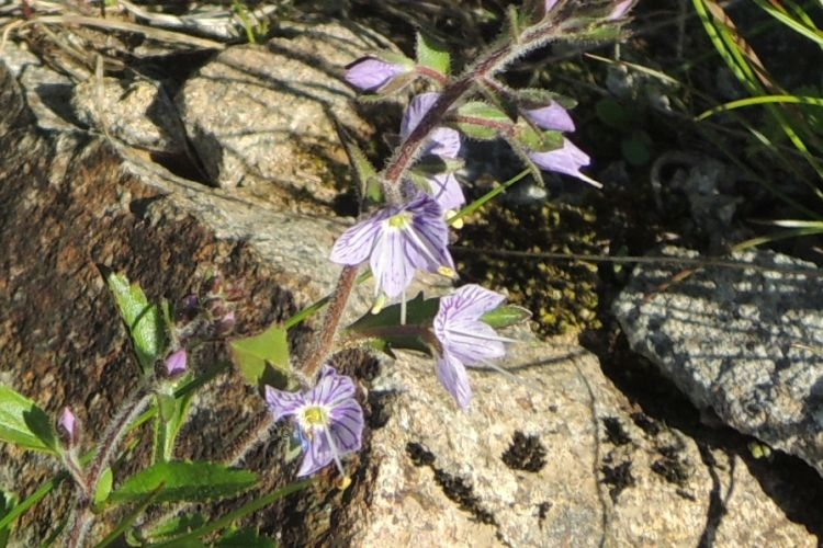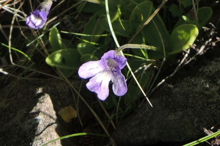 花弁の紫のすじと長く飛び出た雄しべと雌しべが特徴的なオオバコ科のミヤマクワガタ。