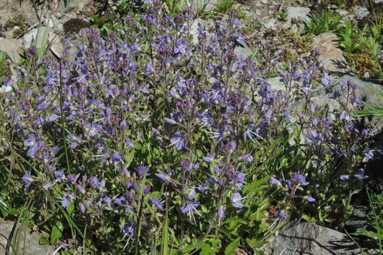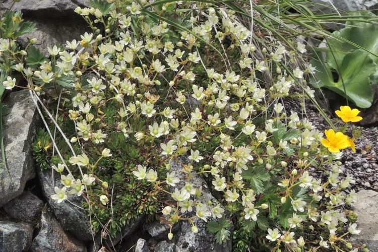 絨毯のように密集した葉をもつ白い花は常緑小低木のイワウメで、その中でマメ科のオヤマノエンドウが場所を争うように咲いていた。