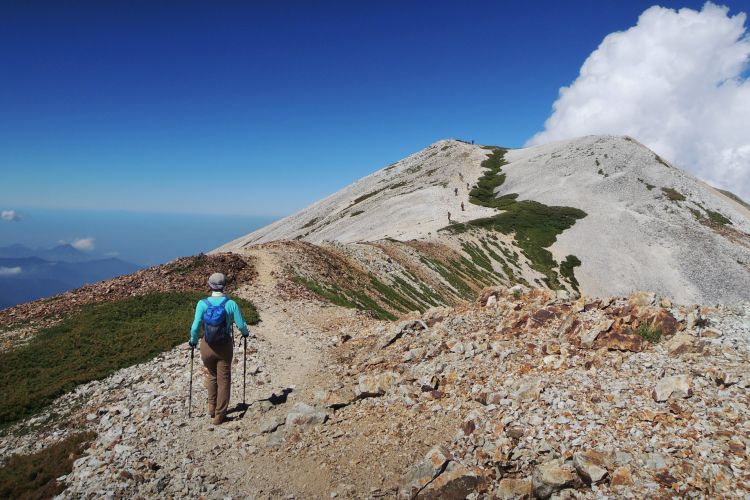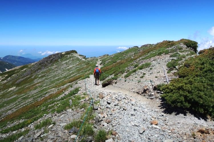 復路も開放感抜群の稜線歩きが続く。午前中は数多く見かけた団体ハイカーの姿も、この時間になると見なくなった。