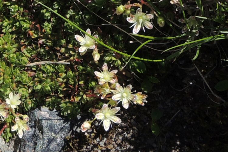 ユキノシタ科のシコタンソウ。小さな五弁花の内側に黄と赤の細かい斑がある。