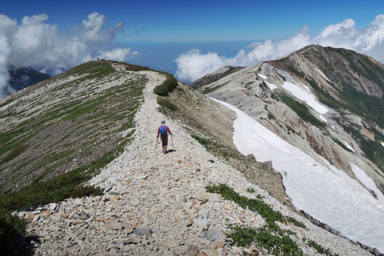 白馬岳まで展望抜群の稜線歩きが延々続く。ルートは見た目よりも起伏があり、進むほどに周囲の景観がどんどん変わった。