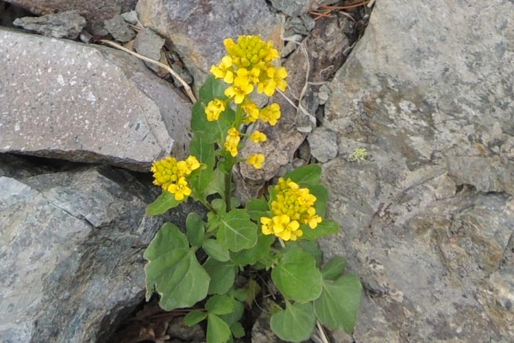 アブラナ科のヤマガラシ(別名ミヤマガラシ)。葉が不揃いだなぁと思って調べてみると、根生葉は羽状に中裂から全裂し、頂小葉は丸くて大きく、茎葉は耳形で基部は茎を抱く、と分かった。