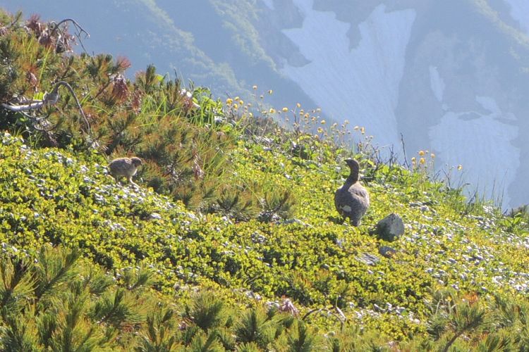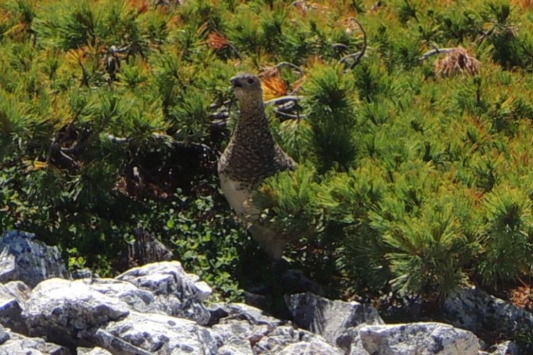 あとはライチョウに会えたら完璧だと話していたので嬉しかった。子どもがハイマツの中に消えてしまい、母ライチョウも辺りを探していた。