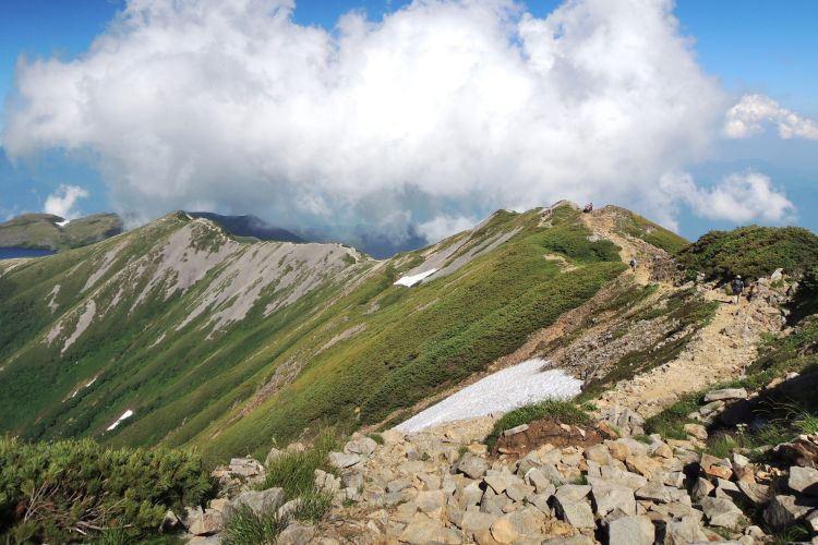 船越ノ頭へ至る稜線。雲に届きそうなところを歩く登山者の姿が点々と見えた。15:30 小蓮華山を出発。