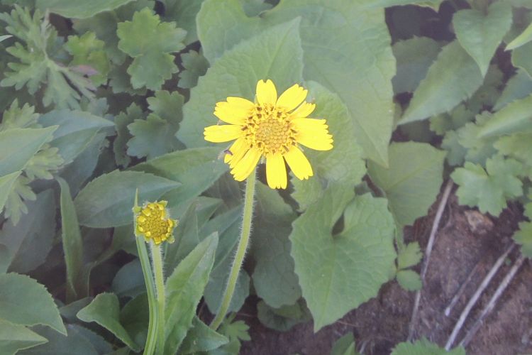 バラ科のミヤマダイコンソウ。黄色い花で似たものは多いが、本種は円形の大きな葉ですぐ見分けがつく。