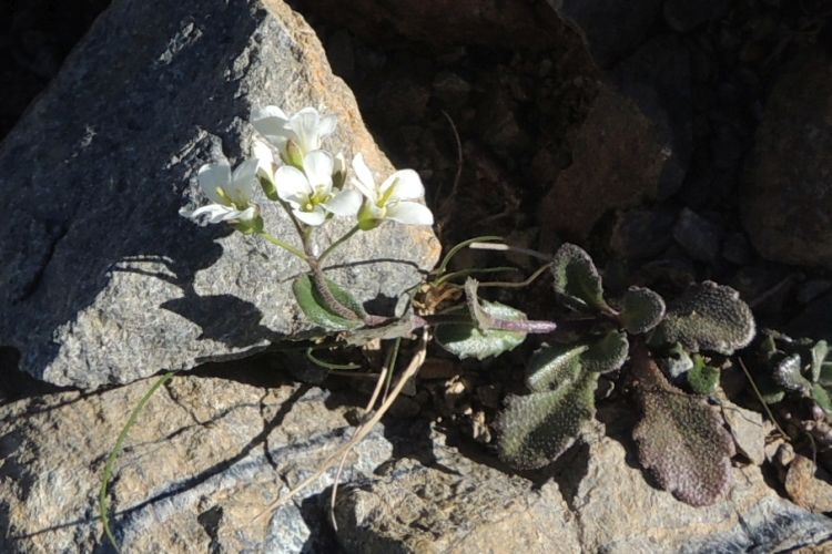 アブラナ科のハタザオやナズナの類いは種類が多くて見分けにくい。茎葉は卵状楕円形で切れ込みは浅く、無柄で茎を抱き込んでいる。茎や葉に星状毛が密生しており、根生葉はへら型で浅い鋸歯がある。ということで、ウメハタザオではなかろうか。