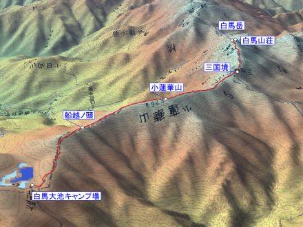 白馬大池キャンプ場 3:45 ⇒ 4:10 雷鳥坂の途中 4:50 ⇒ 5:10 船越ノ頭 5:25 ⇒ 6:30 小蓮華山 6:35 ⇒ 三国境 7:30 ⇒ 8:25 白馬岳 9:25 ⇒ 9:35 白馬山荘 10:45 ⇒ 11:10 白馬岳 12:15 ⇒ 三国境 13:55 - (ライチョウ観察10分) ⇒ 15:10 小蓮華山 15:30 ⇒ 船越ノ頭 16:30 ⇒ 白馬大池キャンプ場 17:05