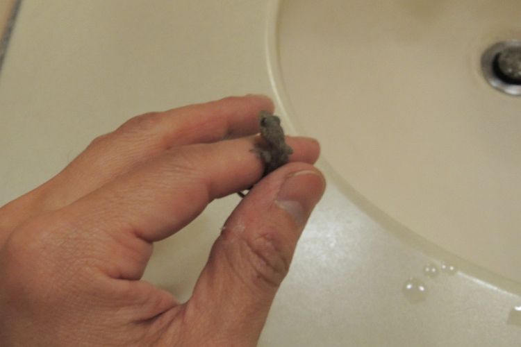 トイレで嫁がヤモリを見つけたと呼ぶので、女子トイレでヤモリを捕まえた。逃げようとする力が強く、小さなヤモリの生命力を感じた。