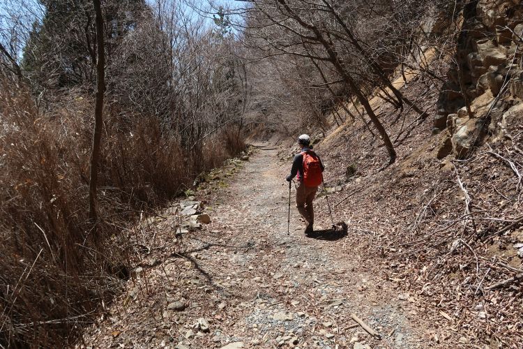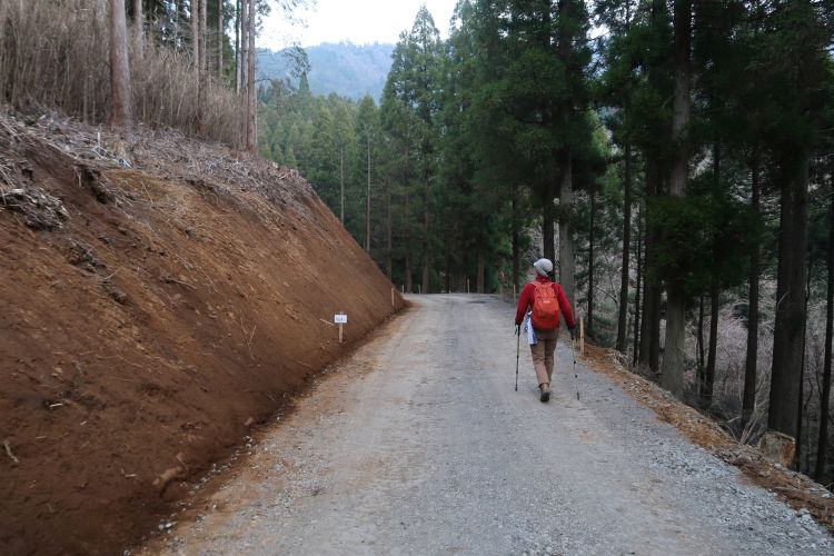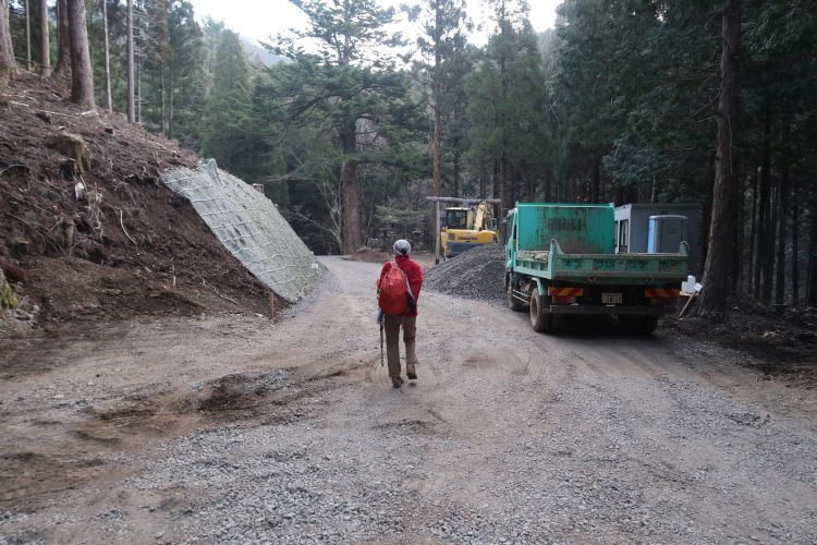 登山口まで林道歩きが続く。3月末終了予定だった工事は2週間ほど延長になっていたが、しばらく終わりそうもない状態だった。