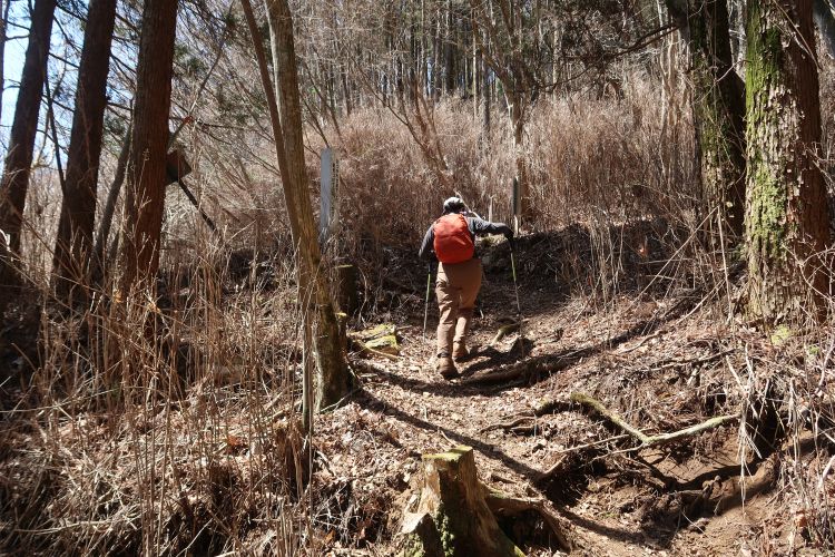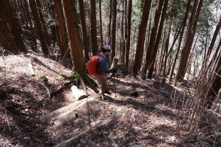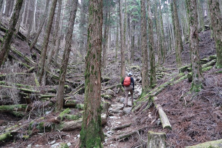 標高の低いところはスギやヒノキの植林帯が続く。展望のきかない薄暗い感じ、倒木や落ちた枝葉の重なり方や苔むした感じが、奥多摩の山に驚くほど似ていた。